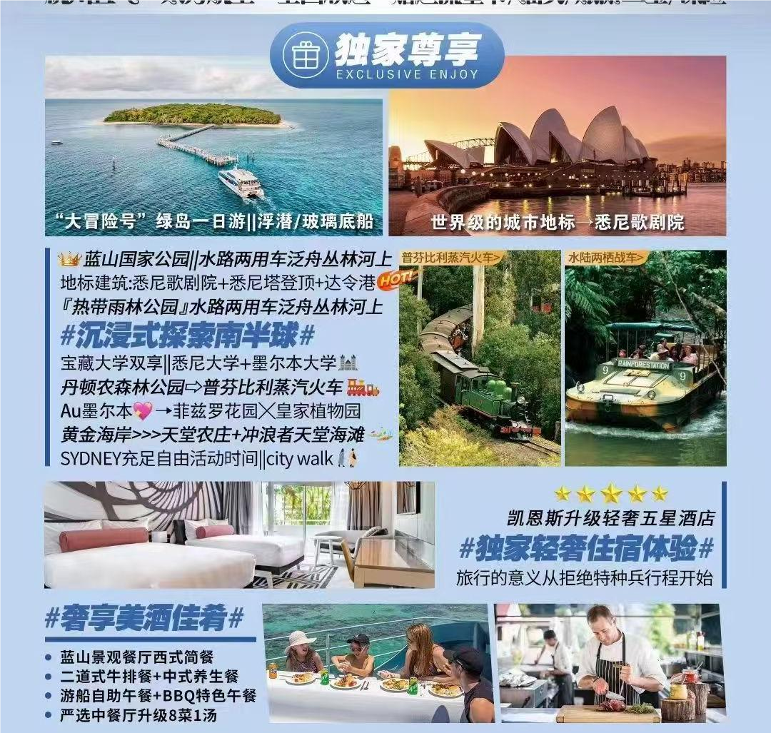 抵達辦理澳洲入境手續(xù); 導游接機后,前往市區(qū)游覽: 游覽【邦迪海灘】(不少于30分鐘):源于澳洲土著語bondi,意為海水拍岸的聲浪,長達1公里的細軟沙灘,水清浪急,是當?shù)叵硎苋展庠?、沖浪運動最佳場所。打卡超夢幻冰淇淋網(wǎng)紅海邊泳池【Icebergs Pool】(不少于15分鐘) 前往【皇家植物園,麥考利夫人椅】(停留不少于30分鐘):澳洲最悠久,植被最豐富的皇家植物園之一,1816年總督麥考利主持建立。公園內(nèi)收集并栽種了7000多種熱帶、亞熱帶特色植物。是外觀悉尼地標——歌劇院、海港大橋等的最佳場所。園內(nèi)一處根據(jù)巖石原形狀雕砌的石椅,即為麥考利夫人椅。 外觀【悉尼歌劇院】(30分鐘,含中文講解)澳洲政府于1956年向世界征求設(shè)計方案時,挑選出了由丹麥建筑師約恩·烏松的設(shè)計作品。于1973年10月20日正式竣工開幕。2007年被聯(lián)合國教科文組織評為世界文化遺產(chǎn)。 入內(nèi)參觀【悉尼大學主校區(qū)】(不少于30分鐘):悉尼市區(qū)以西8公里處的小高地上,是一處始建于1850年的英式古堡式建筑群,是澳大利亞歷史最悠久,也是最負世界盛名的綜合性大學。 前往【悉尼情人港】(停留30分鐘):情人港為紀念歐洲移民到達澳洲200周年,綜合性區(qū)域于1988年落成,集游艇、戶外咖啡館、餐廳及酒吧于一體,海鷗與海港相映成趣,是當?shù)厝撕秃M庥姓n休閑的最佳場所。